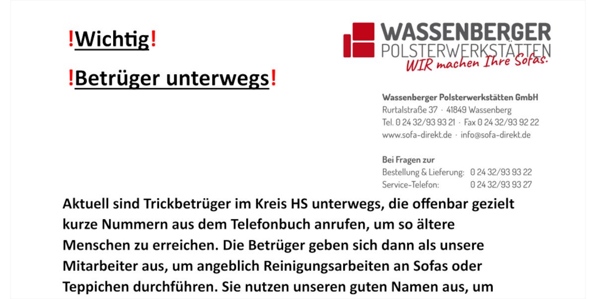 Achtung – Betrüger unterwegs Ende voriger Woche bekam der Gewerbeverein Wassenberg eine ausführliche E-Mail der Wassenberger Posterwerkstätten. In der Nachricht wird vor Betrügern gewarnt wird, welche im Kreis Heinsberg ihr Unwesen treiben und den Namen der Wassenberger Polsterwerkstätten missbrauchen. Lassen Sie sich nicht täuschen Die Wassenberger Werkstätten bieten niemals aktiv […]